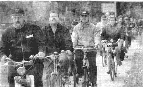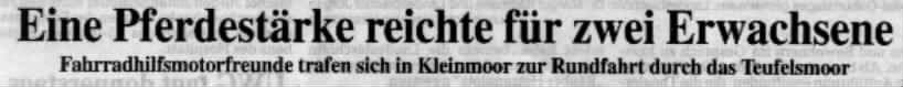 ![]() | Wie seit einigen Jahren fand auch 2002 wieder ein Treffen der Fahimo-Freunde in Lilienthal bei Bremen statt. Es wurde wie immer eine sehr gelungene Veranstaltung. Mehr als 50 knatternde Zweiräder brausten an den teilweise verdutzten aber auch begeisterten Passanten vorbei. Unvergesslich ist mir hierbei eine elegante Dame, die sich bei unserer Vorbeifahrt in dem Künstersdorf Worpswede mit einem Papiertaschentuch vor der Nase etwas angewidert abwendete. | |||||||||||||||||||||||||||||||||||||||||||||||||||||||||||||||||||||||