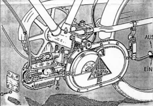 ... wird als "König der Oldtimer" bezeichnet, da dieser zu seiner Zeit Anfang der 50'er Jahre sehr beliebt war. Ein Motor mit anfangs 31 ccm (FM31) über dem Vorderrad treibt über einen Keilriemen eine am Vorderrad in den Speichen zentrisch befestigte Keilriemenfelge an. Nachfolgende Typen hatten einen höheren Hubraum (FM34, FM50) und konnten dann mit entsprechenden Anbauteilen auch im Fahrradrahmen befestigt werden. | ||||||||||||||||||||||||||||||||||||||||||||||||||||||||||||||||||