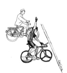 Mit einer faustdicken Überraschung ist das in diesem Jahr am 26.7. erstmalig ausgetragene Dietrich-Thorau-Gedächt- nisrennen um den Teckpokal zu Ende gegangen. Entgegen der Prognosen aller Experten hat nicht der hochfavorisierte Fahrer mit der Startnummer 1 N.S. aus K. gewonnen, sondern der Außenseiter H.W. aus P., dem zuvor nur geringe Chancen eingeräumt wurden. Dabei fiel der Sieg jedoch denkbar knapp aus. Da unser Fotoreporter während der Zieleinfahrt gerade auf dem Klo saß, und außerdem - wie sich erst später herausstellte - überhaupt keine Kamera bei sich hatte, müssen wir uns auf die im Augenblick des Triumphs von einem zufällig anwesenden Gerichts- zeichner angefertigte Skizze stützen. |